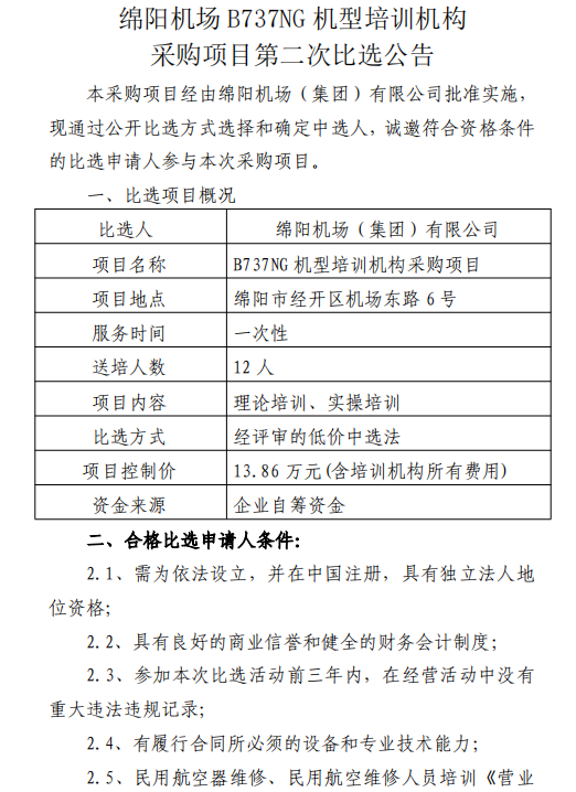綿陽機(jī)場B737NG機(jī)型培訓(xùn)機(jī)構(gòu)采購項目第二次比選公告