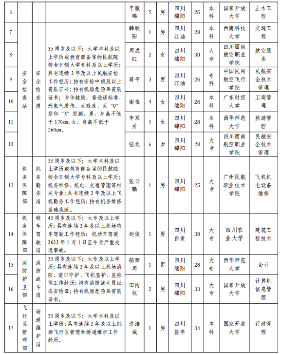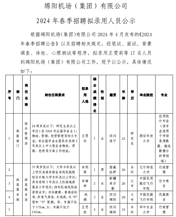 綿陽機場(集團)有限公司 2024年春季招聘擬錄用人員公示